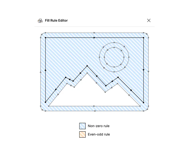 When changing an icon or pictogram from even-odd to non-zero it is possible that you will see areas being filled instead of transparent, that’s easy to fix. Click on the small black arrows to turn their direction. Two arrows going in the same direction will fill your object, and two arrows going in the opposite direction will make your object transparent.