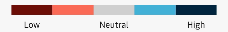 Diverging colours are also ordered. Use these for ordinal and ratio scales, especially when there is a meaningful middle value. These may also be used for interval scales. Do not use these for categorical scales.
